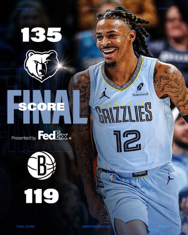 灰熊(18-8):莫兰特28分7篮板10助攻、贝恩21分4篮板8助攻、阿尔达马20分6篮板、贾伦-杰克逊20分7篮板5抢断、克拉克14分8篮板、韦尔斯12分5篮板3助攻